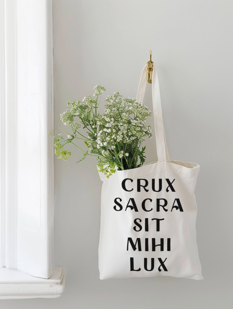 For centuries, the Latin prayer of St. Benedict has armed the faithful against darkness. Now this roomy tote lets you carry it boldly into lecture halls, coffee runs, and the Holy Mass.